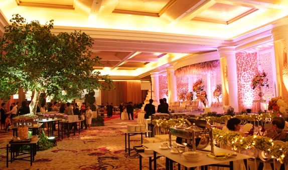 Paket wedding lengkap mencakup sewa ballroom, dekorasi elegan, menu prasmanan atau plated service Indonesia dan internasional, food tasting untuk keluarga inti.